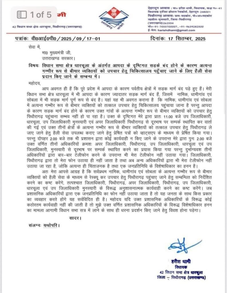 पिथौरागढ़/ धारचूला। धारचूला के विधायक हरीश धामी ने आपदा प्रभावित क्षेत्रों में गंभीर रूप से बीमार लोगों को अस्पताल पहुंचाने के लिए तुरंत हेलीकॉप्टर सेवा उपलब्ध कराने की मांग की है। उन्होंने मुख्यमंत्री को लिखे एक पत्र में कहा है कि धारचूला विधानसभा क्षेत्र के नामिक, धामीगांव और सोबला में सड़कें बंद होने के कारण गंभीर मरीजों को पिथौरागढ़ ले जाना संभव नहीं हो पा रहा है।